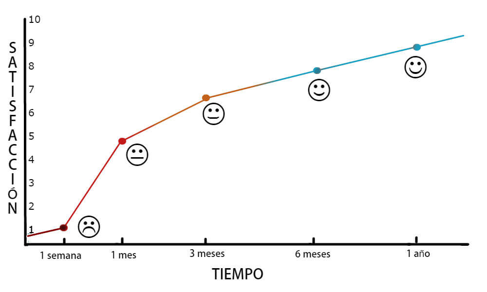A este respecto, es importante saber que, incluso si inicialmente el paciente siente que los resultados estéticos de su cirugía no son los mejores, nuestra experiencia de más de 20 años nos dice que el proceso de aceptación del paciente de cirugía ortognática tarda entre 3 hasta 15 meses para una adaptación (y desinflamación) totales, siguiendo normalmente el siguiente recorrido:
